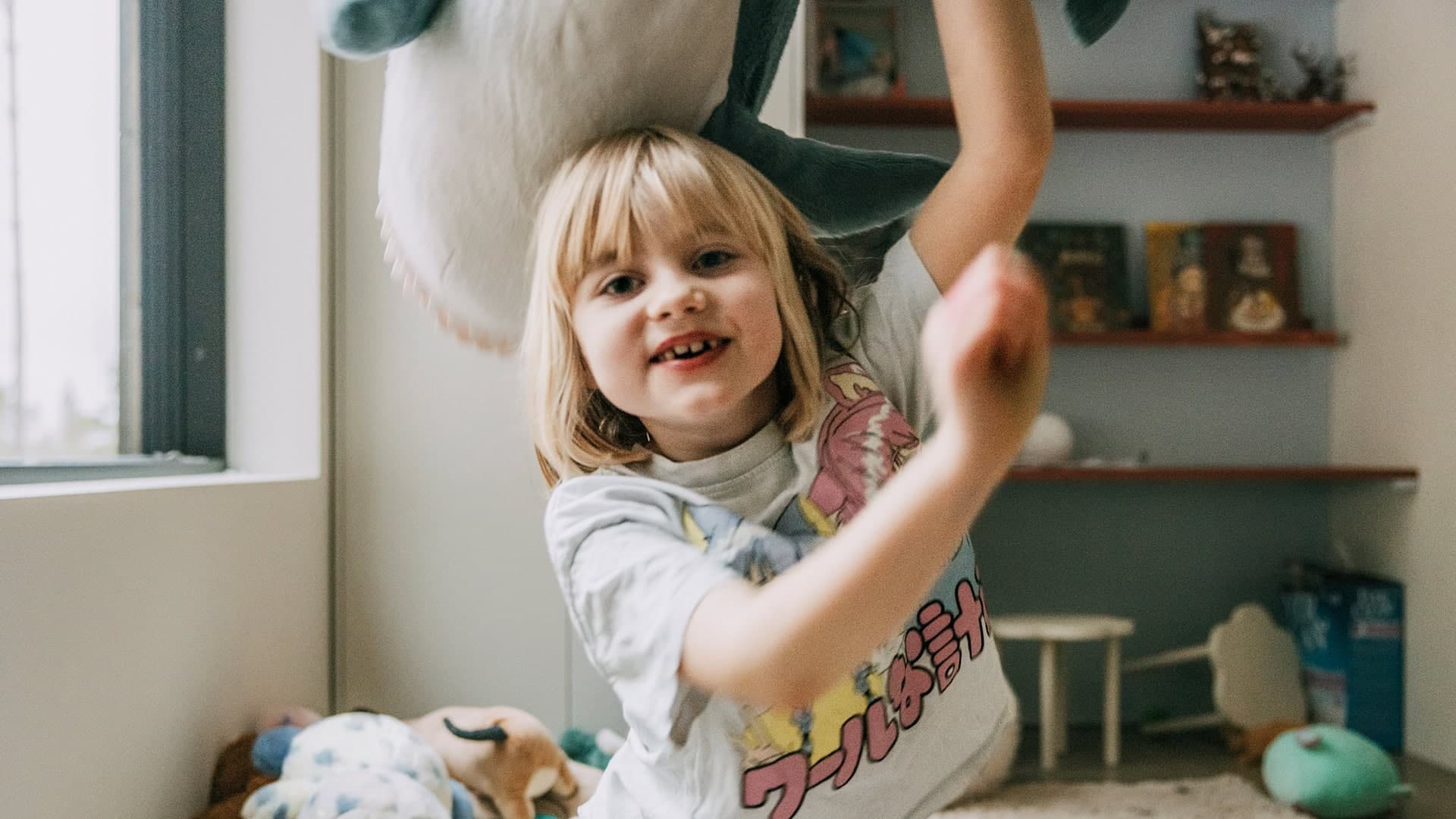 Och det dröjer inte länge förrän Duni kommer utspringande igen. Hon har famnen full av gosedjur och drar med sig David in till rummet för att leka kuddkrig.